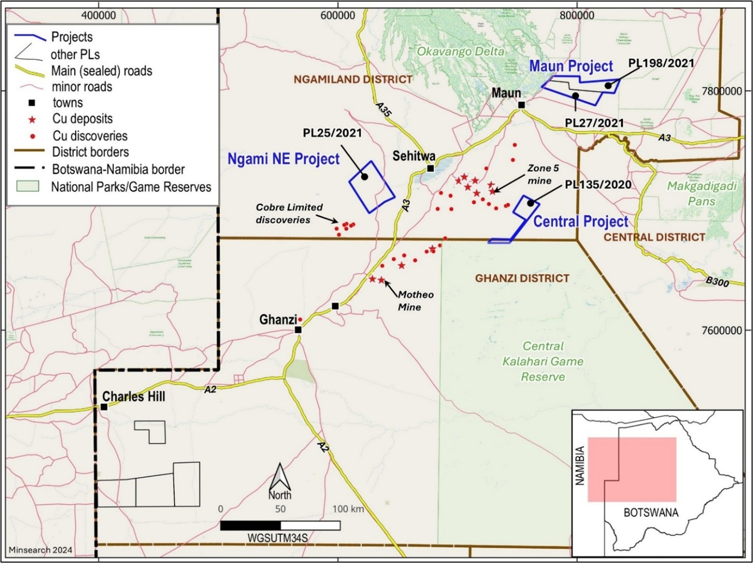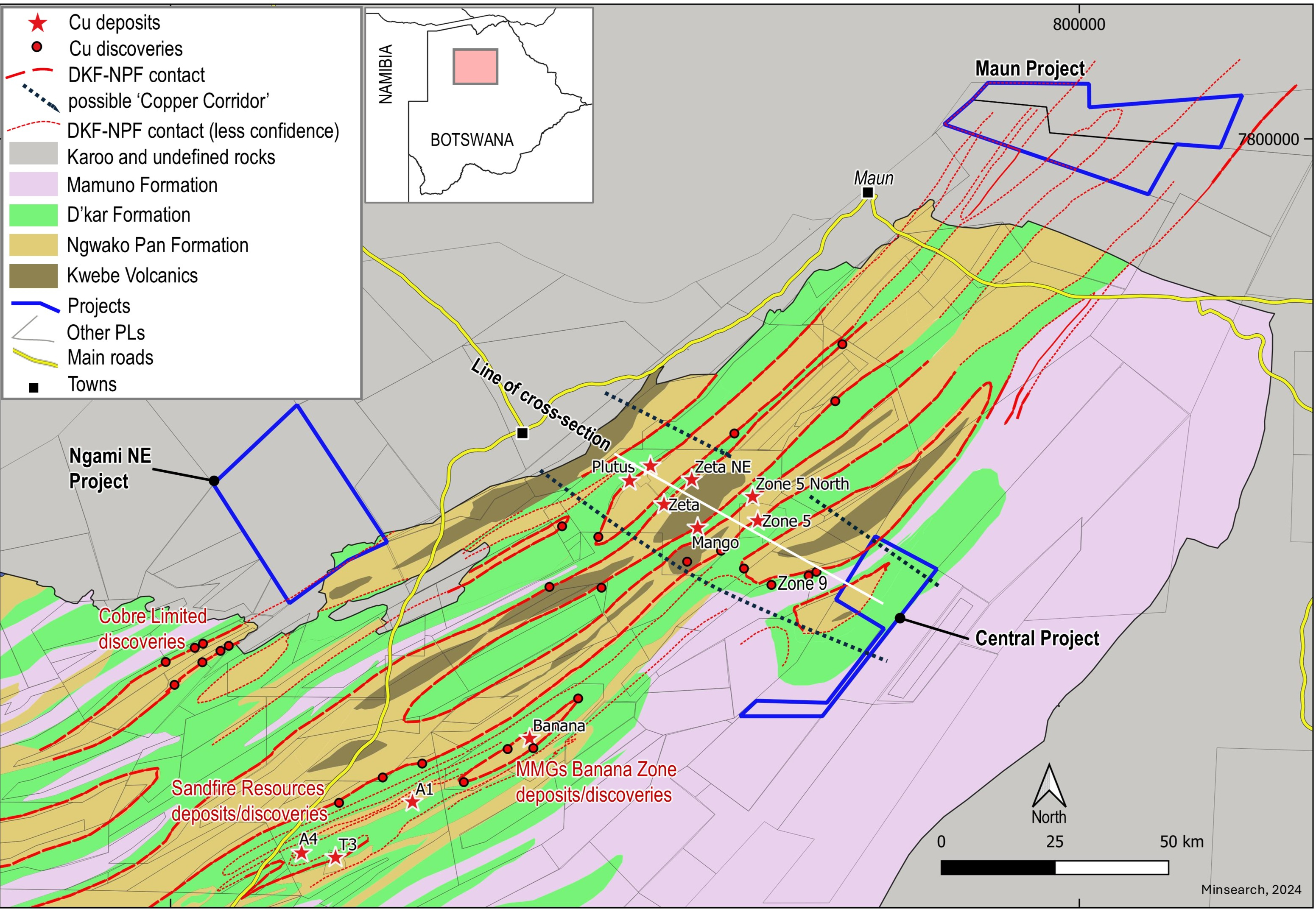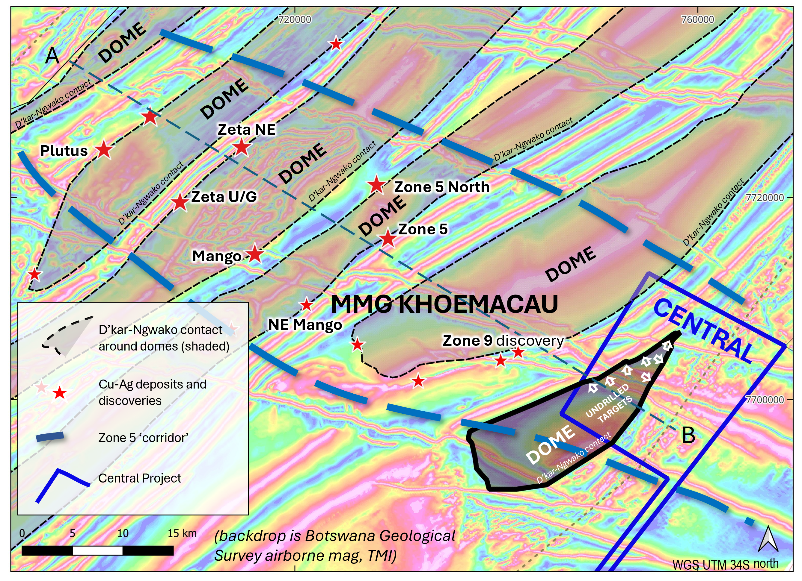 An airborne electromagnetic (AEM) survey both of this dome and the continuation of the Mowana fold limb will be flown shortly, from which it is expected that a series of drilling targets will be developed. Like MMG’s ground, the Central Project is covered by a cover of Kalahari overburden, hence the importance of quality geophysical data.