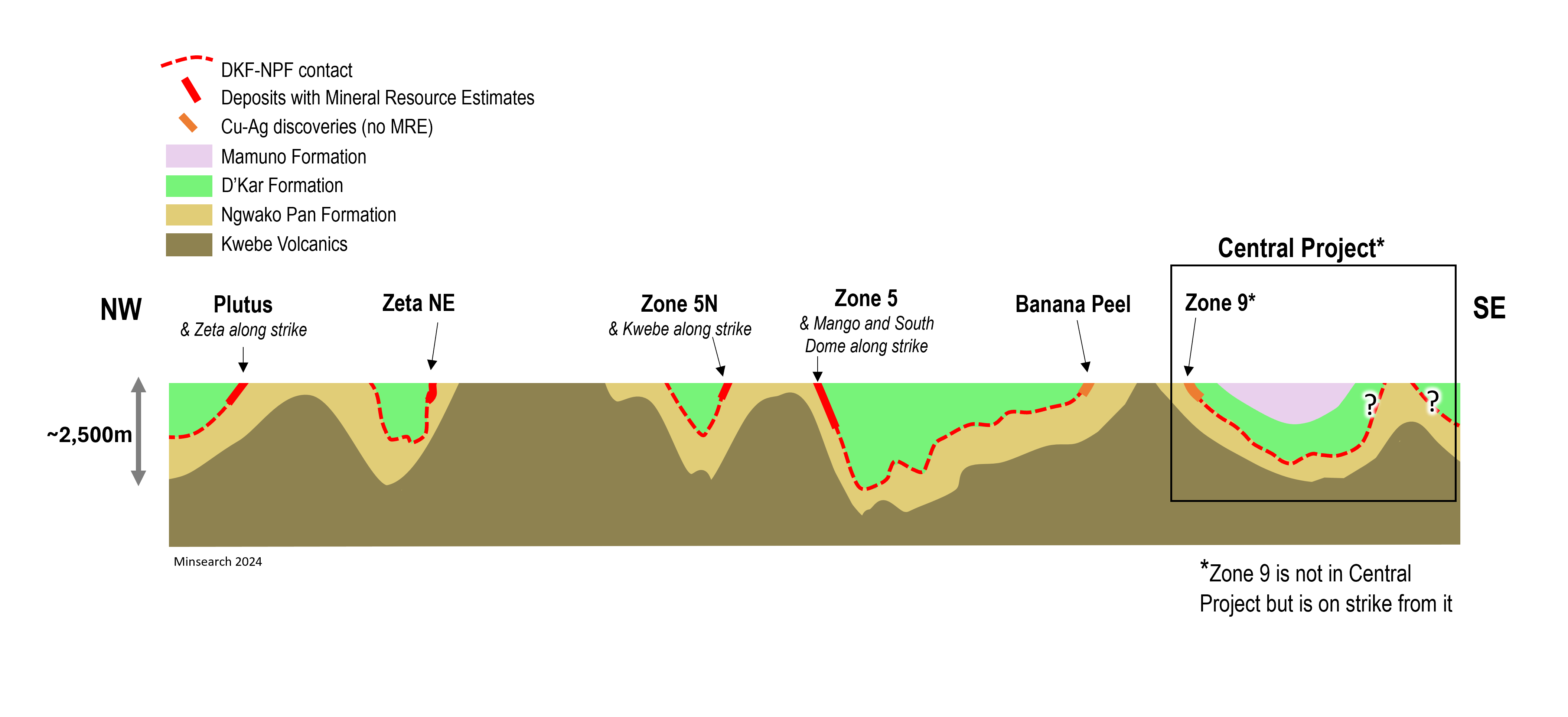 Most known KCB Cu-Ag deposits are located at or near a well-understood stratigraphic boundary, specifically that between Ngwako Pan Formation and the overlying D’Kar Formation, or more simply the “DKF-NPF contact”, itself a so-called “redox” boundary. Deposits form in favourable structural sites such as fold hinges, parasitic folds, shears and thrusts, considered important in channeling and constraining fluid flow, and in trapping the fluids. Copper mineralization is present in sulphide forms, including chalcopyrite, bornite and chalcocite, and can attain thicknesses of tens of meters, extending hundreds of meters along strike and dip.